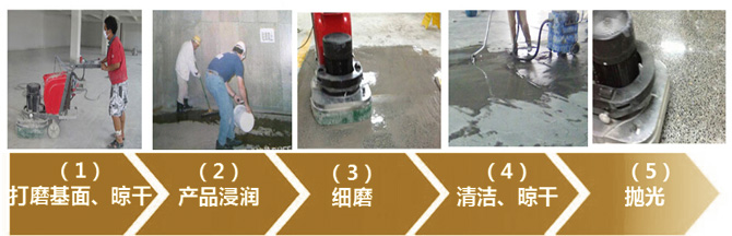 施工工藝:清理基面→初步打磨→坑洞修補→不平整處點補→噴灑混凝土密封固化劑及加強劑→濕潤地面→初步拋光→拋光→地面養(yǎng)護(hù)