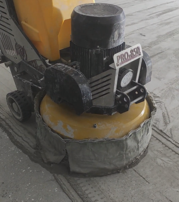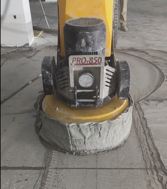 使用專業(yè)打磨機對基面進行打磨,依地面情況選擇干磨或水磨,先用50目樹脂磨片打磨兩遍,再用100樹脂磨片打磨兩遍,打磨完后清理表面浮漿、灰塵,打開原有地面的空隙,讓混凝土密封固化劑可以充分滲透,坑洞修補及不平整處點補。